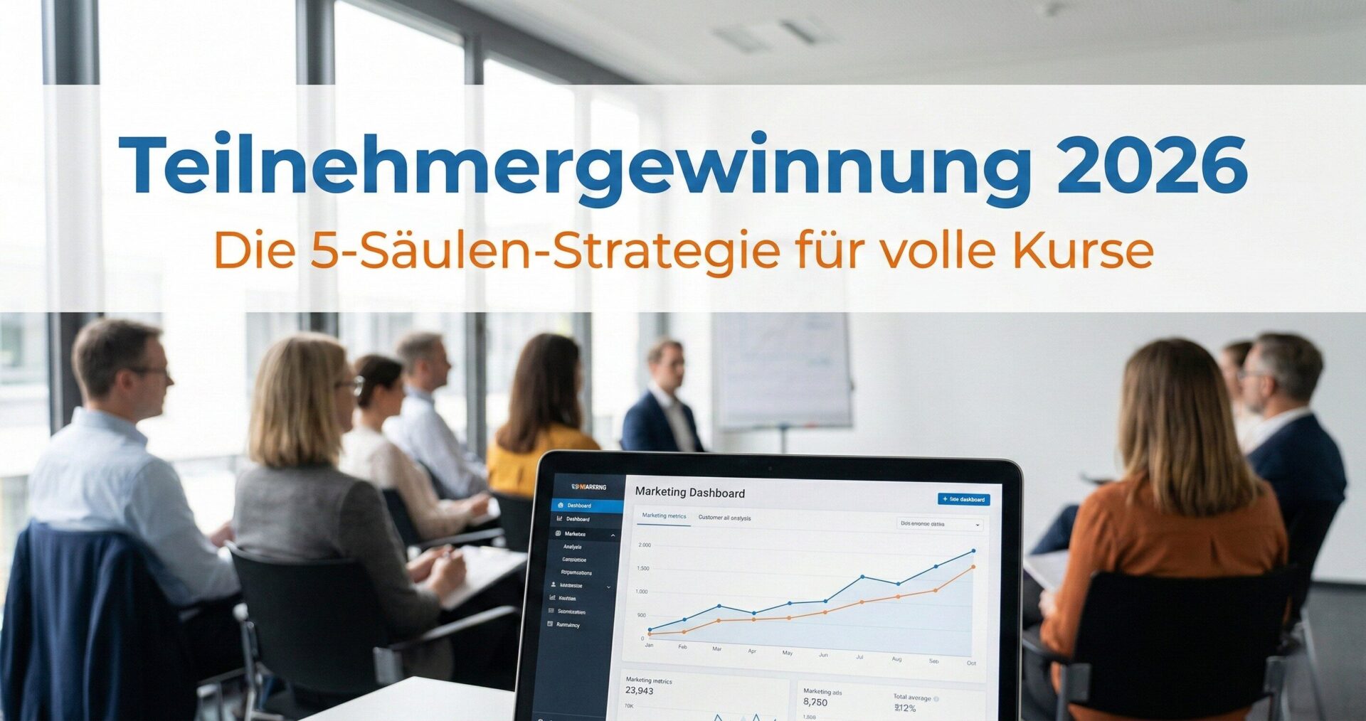 Dieser Leitfaden gibt Ihnen ein erprobtes Rahmenwerk an die Hand: die fünf Säulen der Teilnehmergewinnung. Jede Säule adressiert einen zentralen Hebel – von der Beziehungspflege mit der Agentur für Arbeit über digitale Sichtbarkeit und bezahlte Werbung bis hin zu automatisierten Prozessen, die aus Interessenten Teilnehmende machen. Das Ziel ist klar: planbare, wiederkehrende Teilnehmerströme, die Ihre Kursauslastung dauerhaft auf 80 bis 95 Prozent heben.